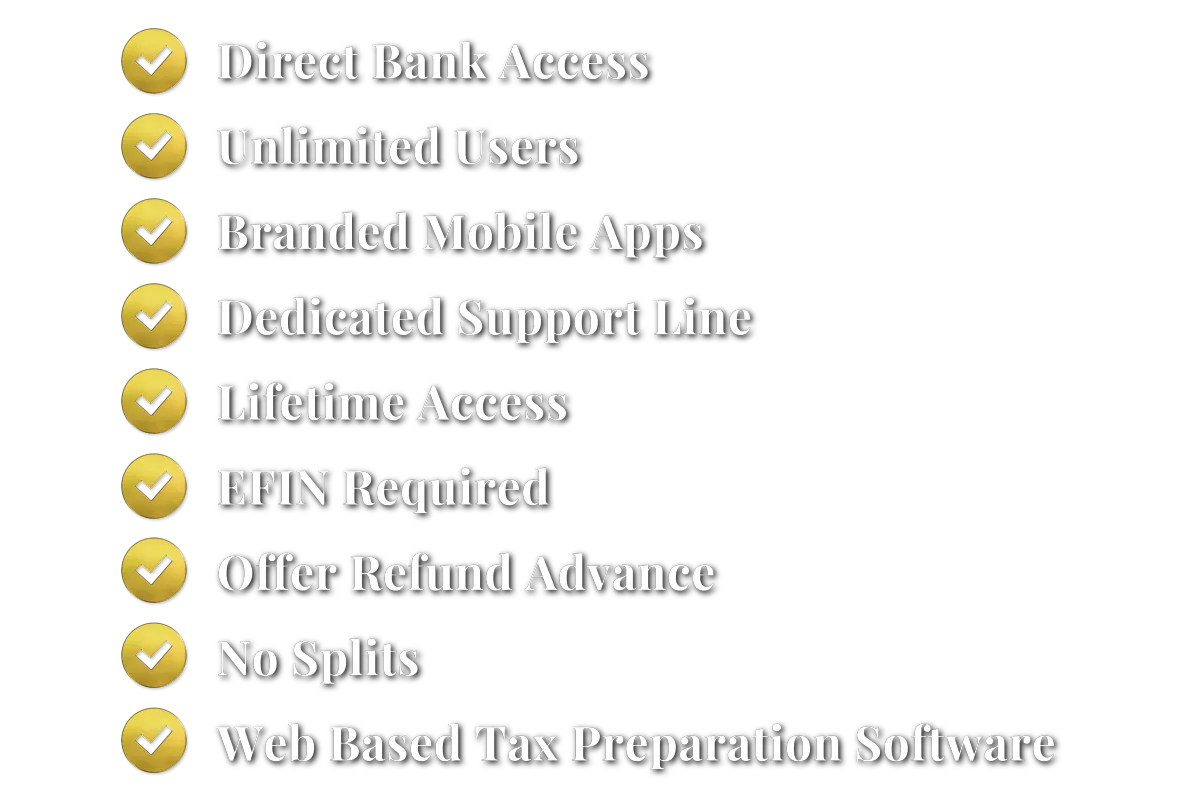 Our platform features Direct Bank Access and Refund Advance options to ensure client satisfaction, while our No Splits policy guarantees you retain 100% of your fees. Designed for scalability, the software supports Unlimited Users and includes Branded Mobile Apps to enhance your firm's visibility and credibility.